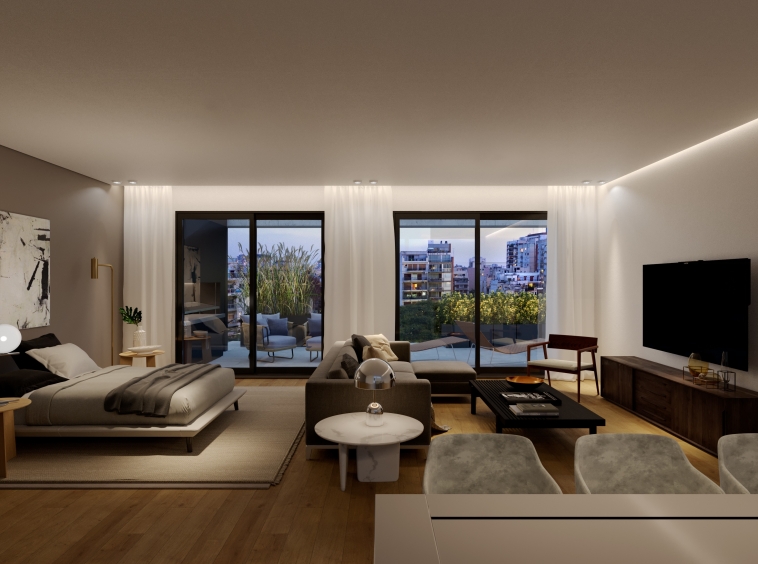 Living comedor con cocina integrada con muebles sobre y bajo mesada. Dormitorio en suite con vestidor. Toilette